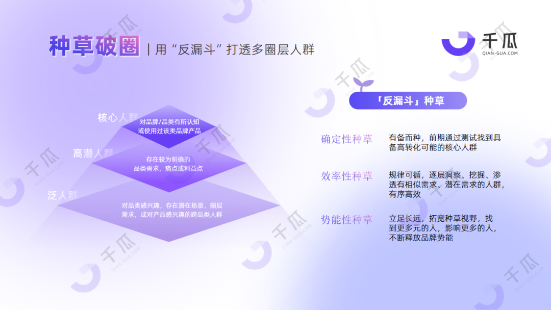 反漏斗模型:核心人群种草→放大渗透→提升市场占有,即从核心人群到泛人群,目标是“破圈”;