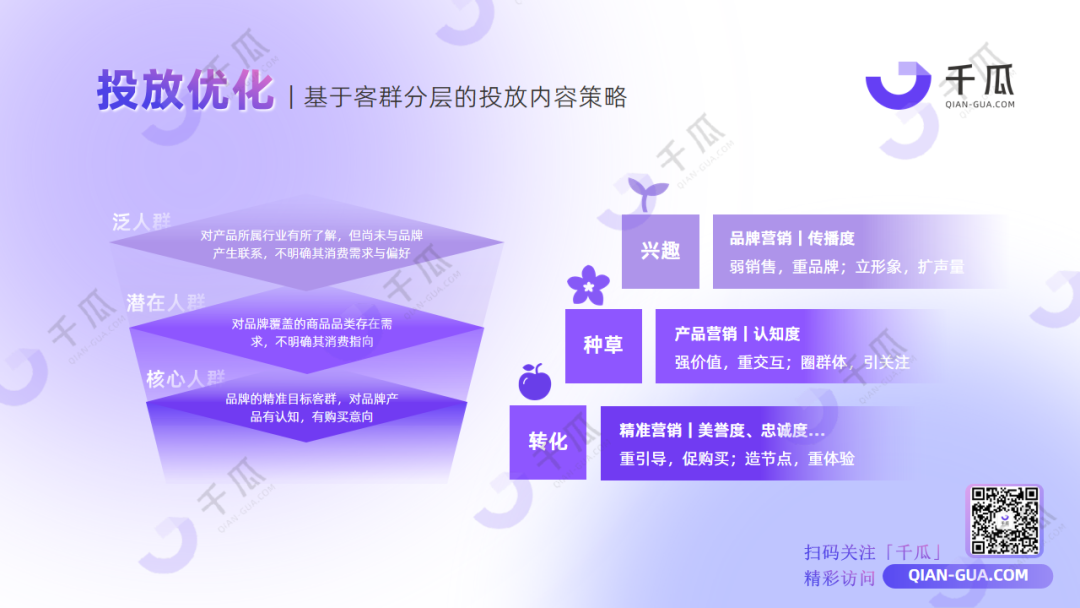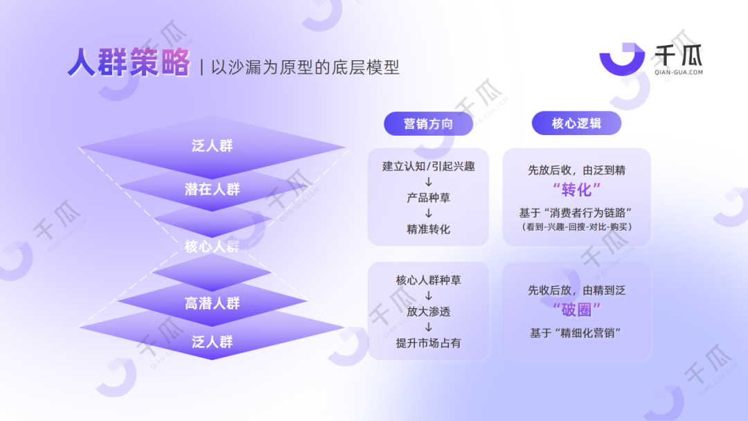 漏斗模型:建立认知/引起兴趣→产品种草→精准转化,即从泛人群到核心人群,目标是“转化”;