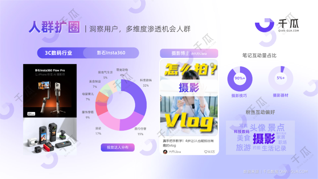 品牌主推摄影器材,投放达人类型:科技数码占32%,通过强关联达人垂直影响摄影爱好者,达成核心人群种草;