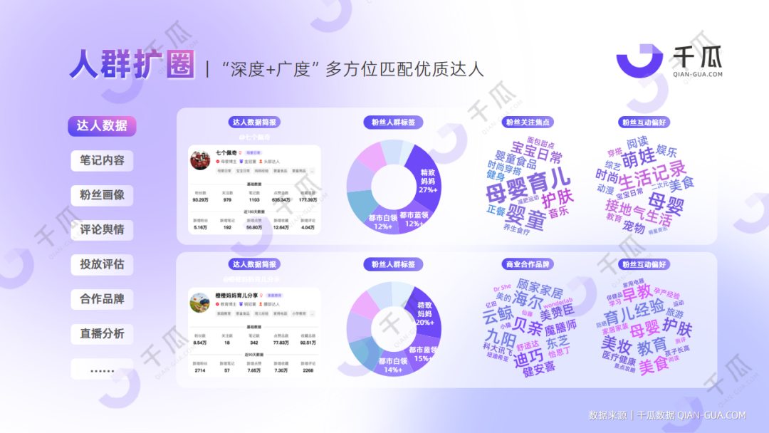 通过“深度、广度”多方位匹配不同类别达人,进而触达其粉丝群体,实现传播与种草。在此过程中,品牌可通过达人数据、笔记内容、粉丝画像、合作品牌等多维度数据,评估达人及其粉丝群体是否符合投放目标。