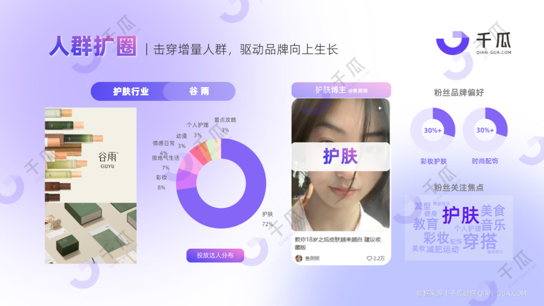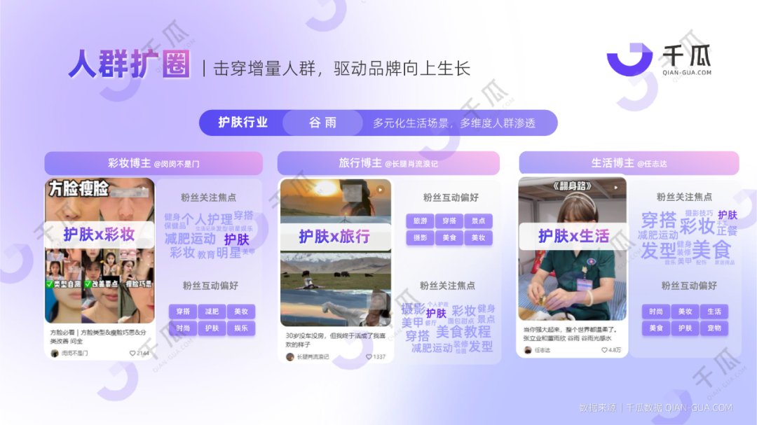 彩妆:往往与护肤高度相关,通过品牌品类相关性,实现品牌到品类的人群破圈。例如,彩妆博主分享瘦脸妆法过程中,自然而然就种草了美白产品;