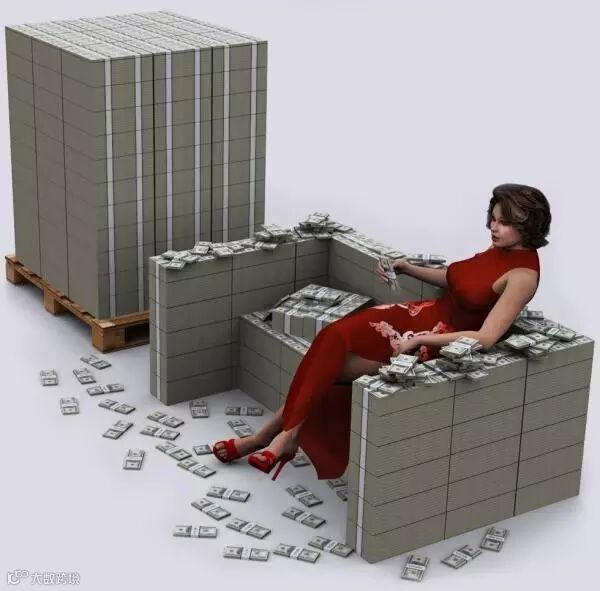 1亿美元:对每个人来说都算是一大笔钱了,装一个ISO或者军用标准尺寸的货板上正合适。图中的沙发是由4670万美元的百元纸钞堆成的。