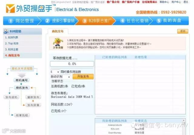 3、 B2B商机发布,这个功能很好,可以把产品一键式发布到很多国外平台上去曝光,对于刚建的新网站,要多去群发商机,最好发布的时间点是晚上七八点。