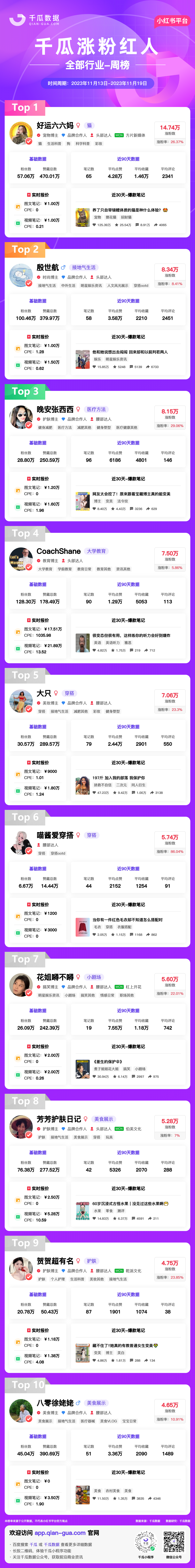 小红书涨粉红人-全部行业中“好运六六妈”排名第一,涨粉数14.74万;“殷世航”排名第二,涨粉数8.34万;“晚安张西西”排名第三,涨粉数8.15万。