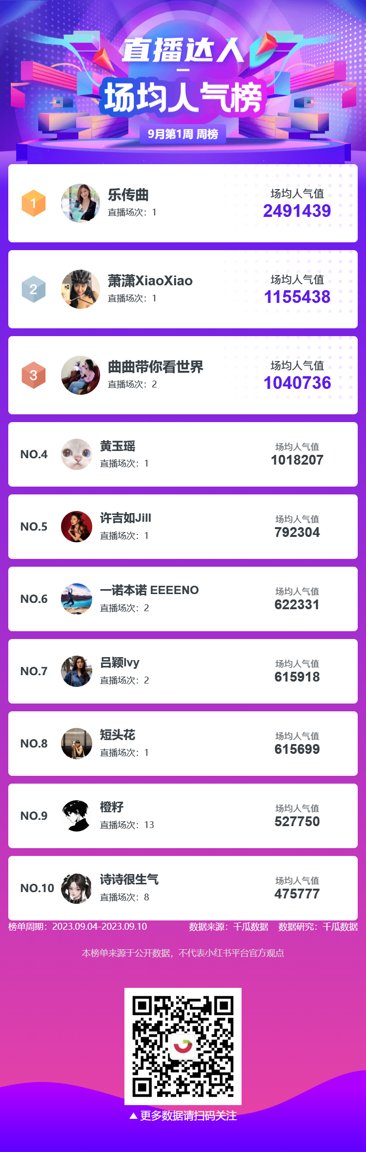 直播达人榜中“乐传曲”排名第一,场均人气值2491439;“萧潇XiaoXiao”排名第二,场均人气值1155438;“曲曲带你看世界”排名第三,场均人气值1040736。