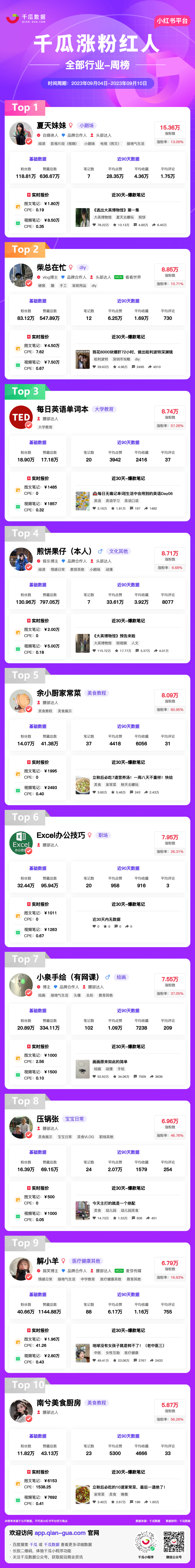 小红书涨粉红人-全部行业中“夏天妹妹”排名第一,涨粉数15.36万;“柴总在忙”排名第二,涨粉数8.85万;“每日英语单词本”排名第三,涨粉数8.74万。