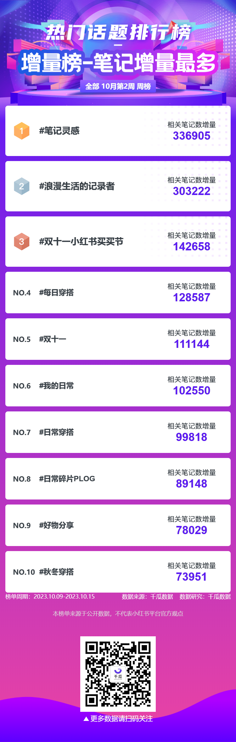 热门话题排行榜中“笔记灵感”排名第一,相关笔记数增量336905;“浪漫生活的记录者” 排名第二,相关笔记数增量303222篇;“#双十一小红书买买节”排名第三,相关笔记数增量142658篇。