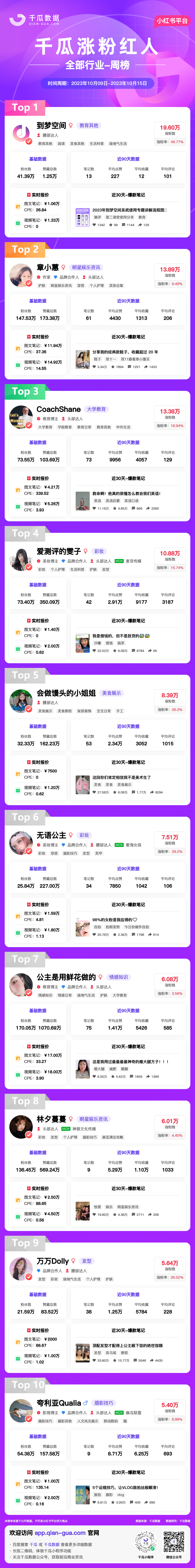小红书涨粉红人-全部行业中“到梦空间”排名第一,涨粉数19.60万;“章小蕙”排名第二,涨粉数13.89万;“CoachShane”排名第三,涨粉数13.38万。