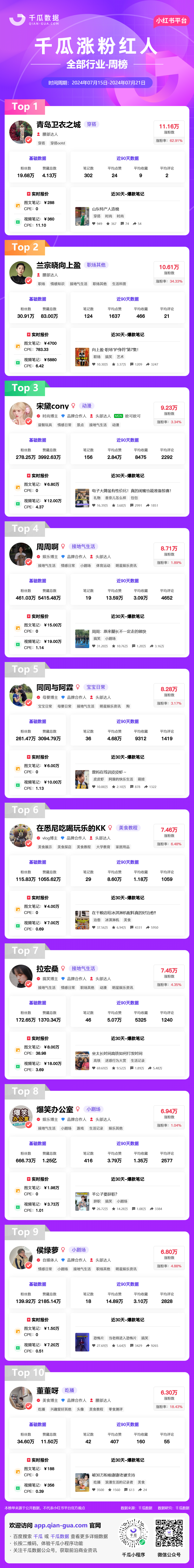 小红书涨粉红人-全部行业中“青岛卫衣之城”排名第一,涨粉数11.16万;“兰宗晓向上盈”排名第二,涨粉数10.61万;“宋黛cony”排名第三,涨粉数9.23万。