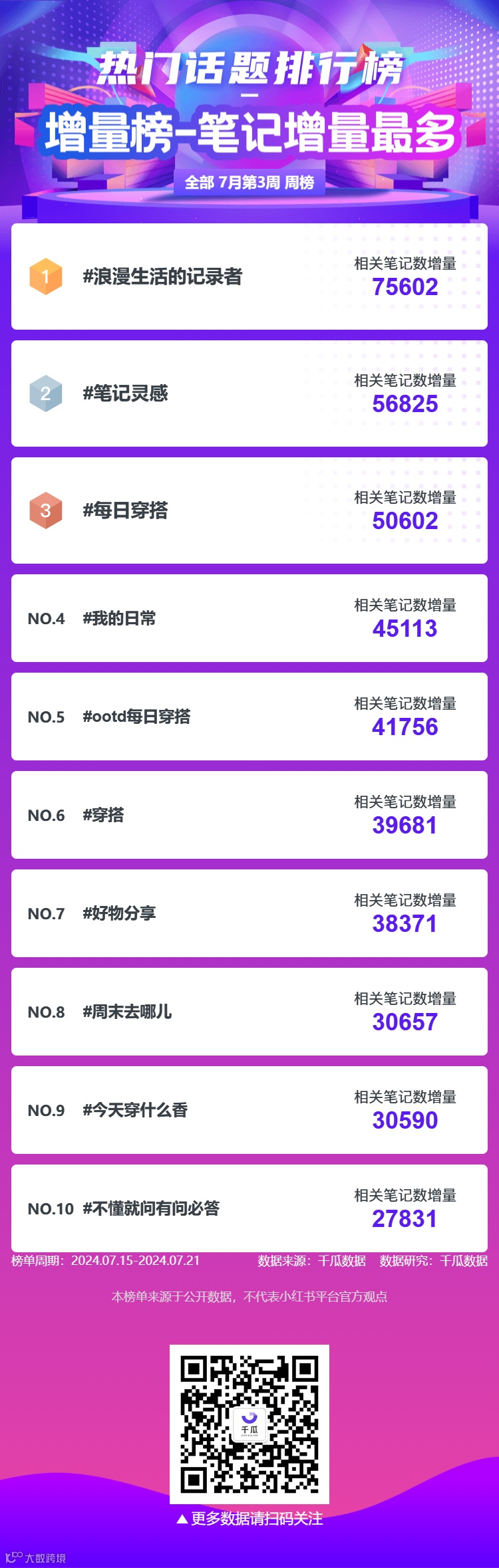 热门话题排行榜中“#浪漫生活的记录者”排名第一,相关笔记数增量75602篇;“#笔记灵感” 排名第二,相关笔记数增量56825篇;“#每日穿搭”排名第三,相关笔记数增量50602篇。