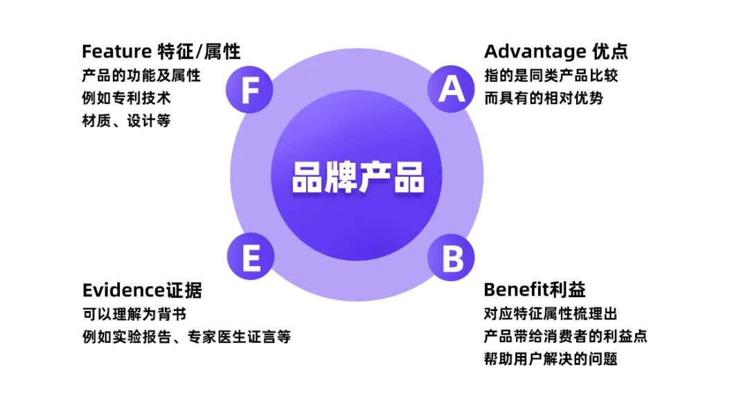 卖点是为用户建立选择的标准,也是打动用户的利益点。在整理产品信息的同时,可以建立多维度产品卖点价值体系,这里能用到万能推销法公式:FABE法则。
