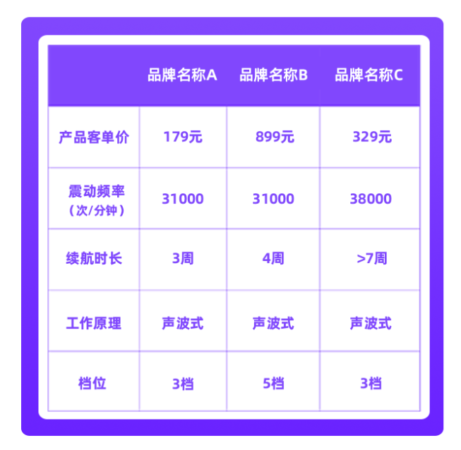 通过举例“电动牙刷”竞品的横向对比,每款产品档位各有不同,5档档位能够根据使用者不同部位、不同时期的牙齿敏感程度进行人性化调节,在同样都为声波式电动牙刷的情况下比3档式更具备优势。