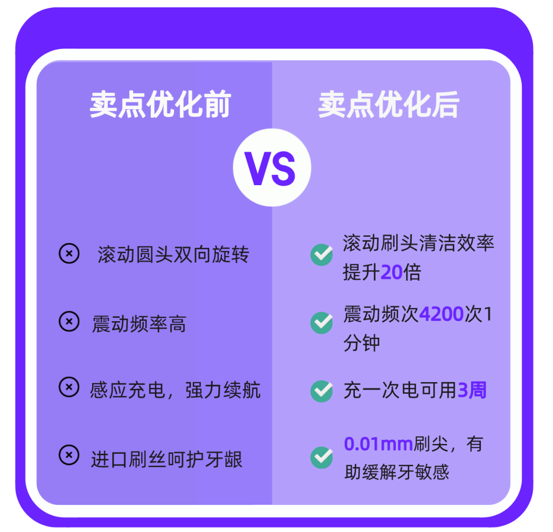 以某功能型产品为例,优化后的卖点具体化+数据化+利益点,“0.01mm刷尖”为产品属性、“有助缓解牙齿敏感”为用户利益点。除了产品上的逻辑说服力,尽量将卖点数据化处理,后续与同类型产品对比时也会更加直观清晰,便于未来细致化的营销。