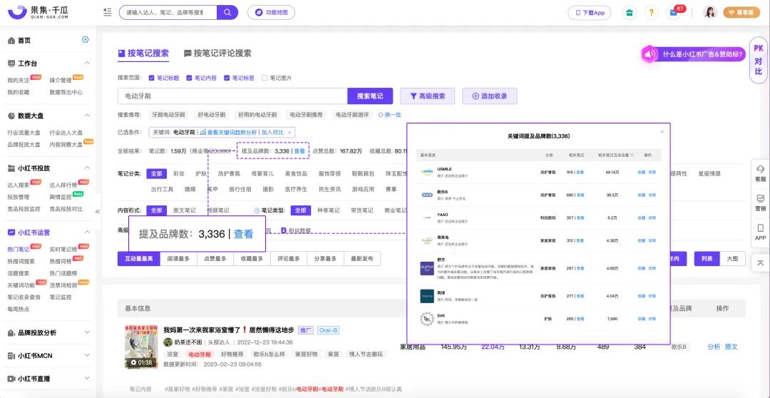 搜索热门笔记“电动牙刷”为例,果集·千瓜数据显示,2022年11月1日-2023年5月1日期间,热门笔记下搜索关键词“电动牙刷”的提及品牌数中USMILE、欧乐B、YAAO品牌相关笔记数量较多。