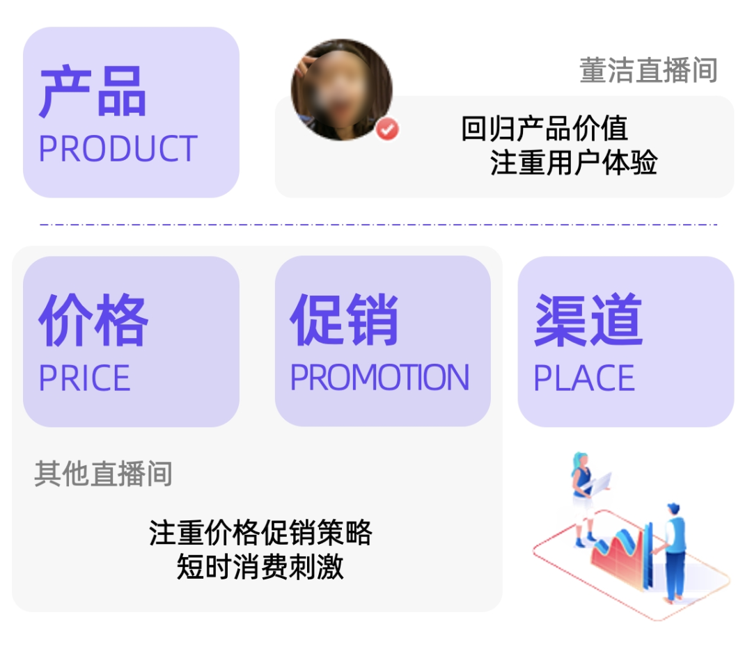 从营销4P理论看待这件事,如果其他直播间是注重促销(Promotion)的短时消费刺激,而小红书董洁直播间则是回到产品(Product)本身,解析产品价值,实现好物种草。