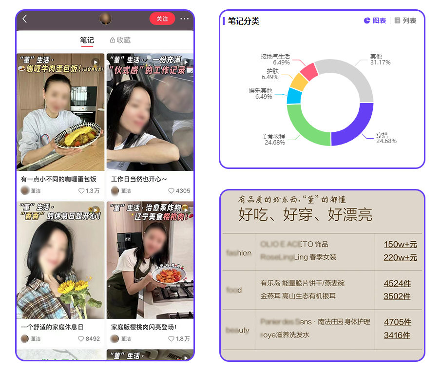 董洁日常便会分享自己为家人做饭、户外运动、爱用物等笔记。果集·千瓜数据显示,近一年她分享的笔记类型:美食教程(占比24.68%)、气质穿搭(占比24.68%)以及护肤(占比6.49%)等。有了漫长的蓄水期和潜移默化的“生活陪伴”,才有直播间同品类产品的高客单转化。