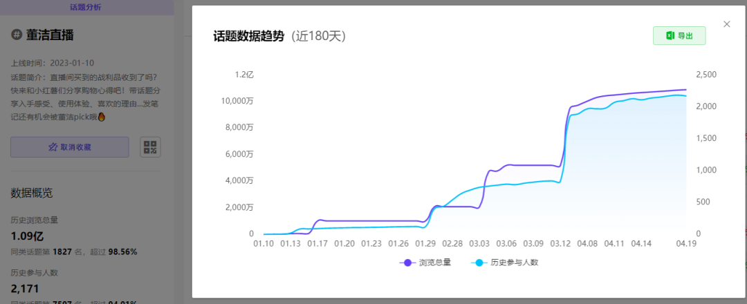 据小红书官方数据显示,董洁三场直播后涨粉110万+,与第二场直播相比,第三场直播成交金额6000万+,累计3场下来GMV破亿。果集·千瓜数据显示,直播结束后话题热度不断走高。至4月中旬,近90天话题浏览量达4622.23万+,引发众网友热议。