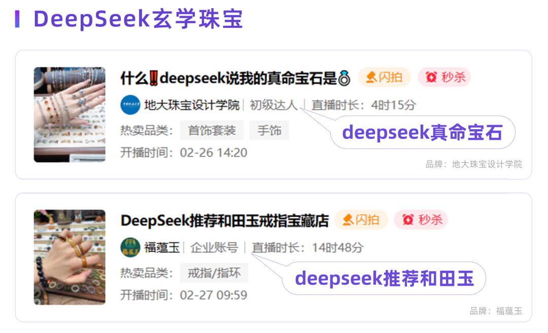 直播间,各大珠宝品牌也加入赛博算命,地大珠宝设计学院、福蕴玉等将“deepseek真命宝石、deepseek推荐和田玉”作为宣传点,吸引用户关注。