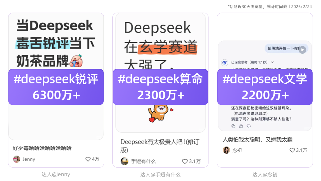 千瓜数据显示,近30天#deepseek锐评、#deepseek算命、#deepseek文学、#deepseek教程 等话题浏览量均达千万级,商业笔记预估互动量达百万级,各大企业也纷纷官宣接入DeepSeek。