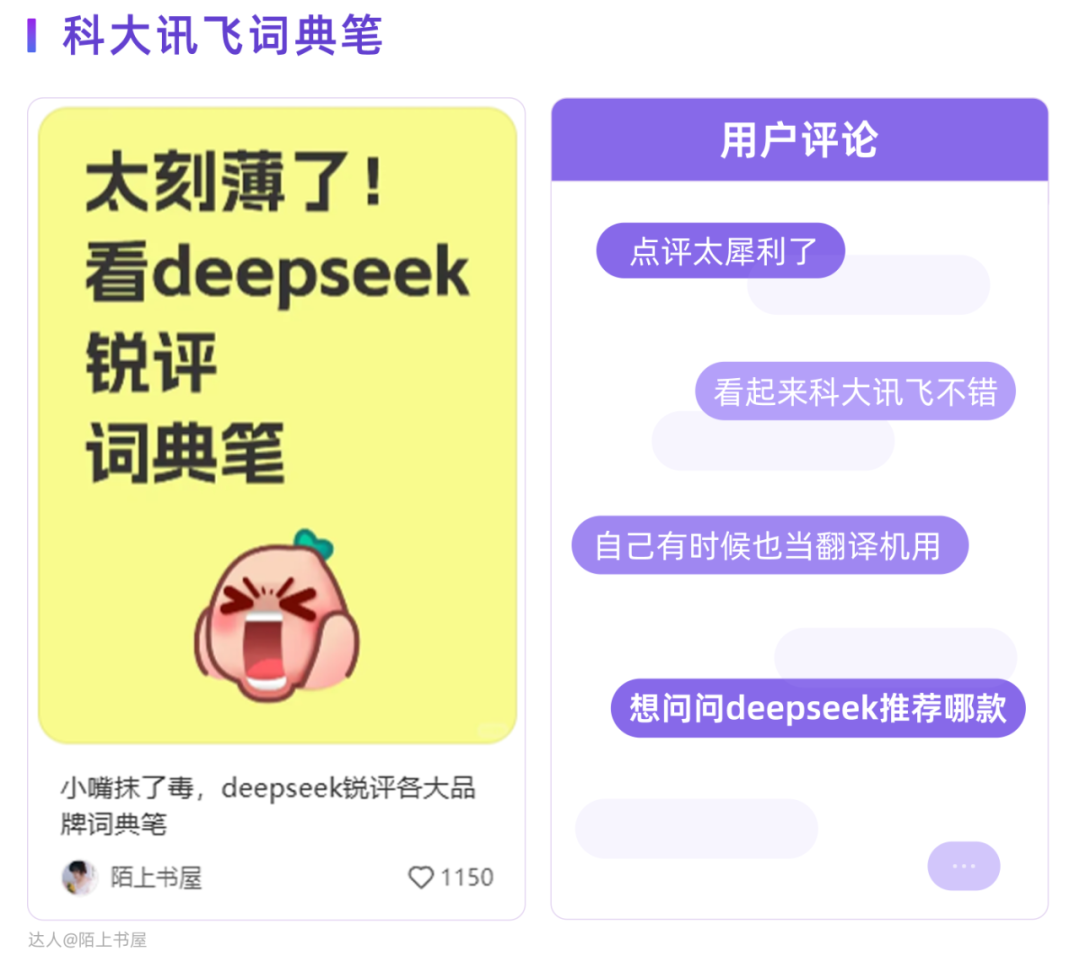 科大讯飞先行入局,与达人合作《小嘴抹了毒,deepseek锐评各大品牌词典笔》,让DeepSeek毒舌锐评自家产品:科大讯飞词典笔是“健身器材”吗?拿久了手腕都酸,不过金属外壳挺耐摔,孩子手滑也不怕坏,算“学渣友好型”设计。