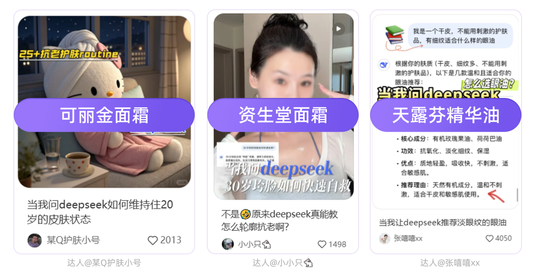 可丽金、资生堂、天露芬等品牌,也纷纷布局DeepSeek提问笔记,借DeepSeek之嘴介绍安利产品,增强可信度和说服力,商业笔记爆文频出。