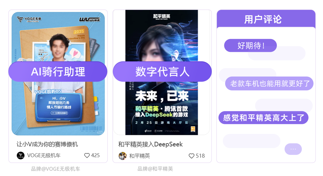 机车品牌@VOGE无极机车、游戏品牌@和平精英等,也都将AI作为“陪伴搭子”:升级“AI骑行助理”,用智能对话、高阶辅助,帮助用户解决生活问题;打造数字代言人吉莉,与玩家实时交流沟通。