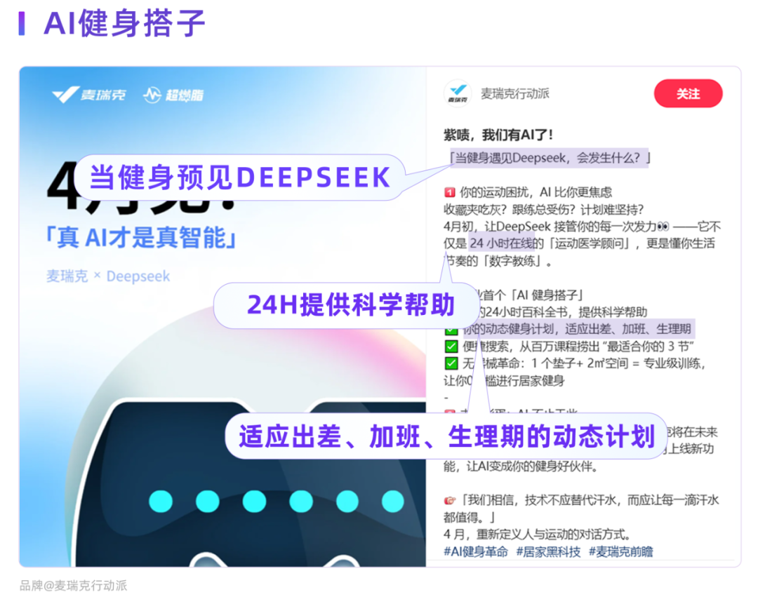 运动器械品牌@MERACH麦瑞克,官宣DeepSeek“AI健身搭子”,集运动医学顾问和数字教练于一身,为用户量身打造动态健身计划、提供科学帮助,重新定义人与运动的对话方式,用户纷纷表示期待。