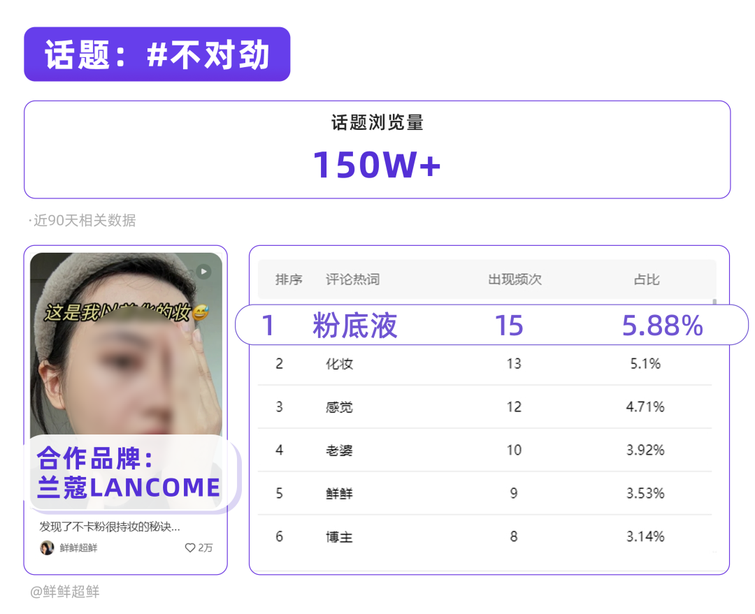 达人@鲜鲜超鲜 发布内容《发现了不卡粉很持妆的秘诀…》,以“认真捯饬半天,但感觉哪儿都不对劲儿”为切入点,顺势植入产品。笔记预估互动量超3.5W,评论热词TOP1为“粉底液”,实现有效种草。
