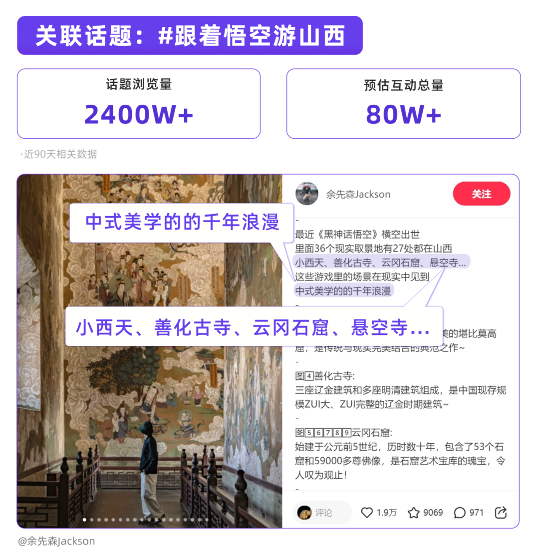 不少品牌洞察机会点,展开合作。此外,山西文旅还推出“跟着悟空游山西”系列活动,通过向“天命人”发放“通关文牒”等方式吸引打卡山西古建。