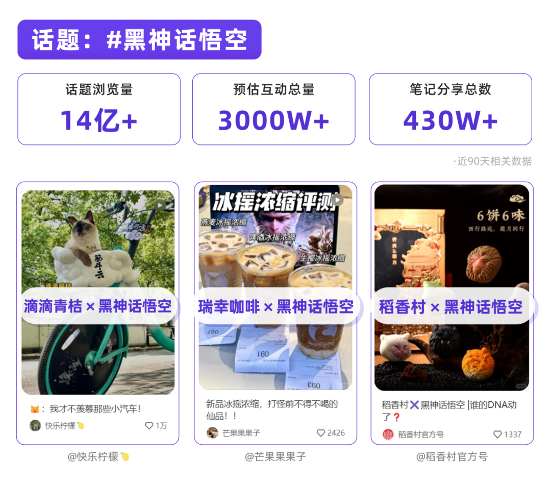 游戏《黑神话:悟空》火爆出圈,小红书同名话题#黑神话悟空 近90天浏览量破14亿,预估笔记互动总量3000W+,游戏中庞大的世界观和传统文化在用户面前一一叙述,“中国风潮”“、“东方美学”惊艳全球。