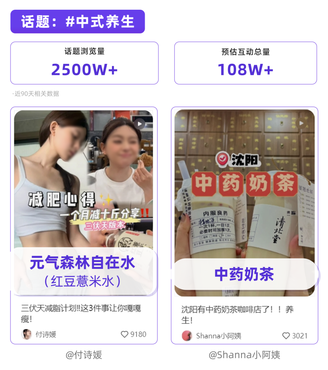 如今,“朋克养生”或成为过去式,年轻人回归传统,重新爱上“一种气血充盈的美”。千瓜数据显示,话题#中式养生 近90天浏览量突破2500W,「中式+养生」再度激发年轻人探索与分享的热情。
