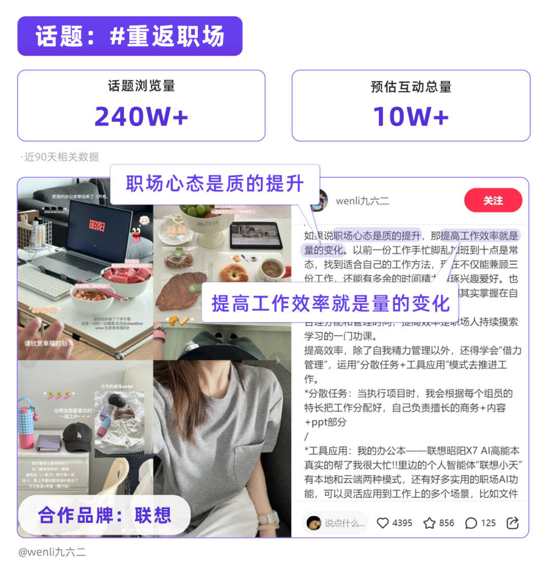 然而如今,第一批大厂离职博主,正集体回去上班。“裸辞”热度依旧居高不下,#重返职场 的话题重新被提起,近90天浏览量200W+。联想、豆包等品牌献招(工作效率提升、面试技巧传授等),帮助打工人重新融入职场。