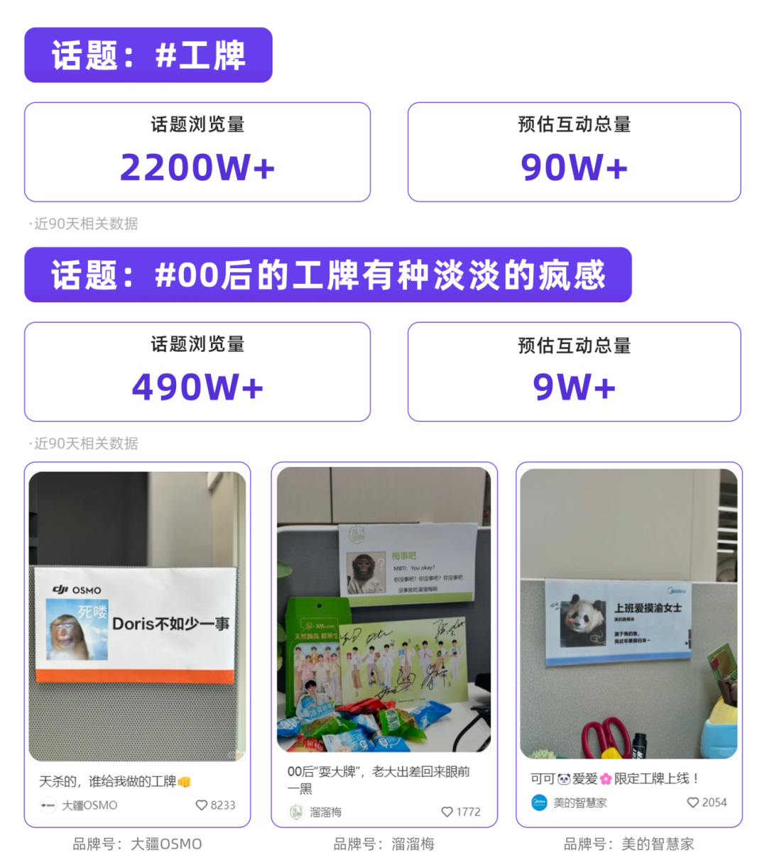 千瓜数据显示,话题#00后的工牌有种淡淡的疯感 近90天浏览量490W+。大疆OSMO、溜溜梅、美的等官方账号纷纷下场发布员工的“工牌”创作,积极与年轻人互动。