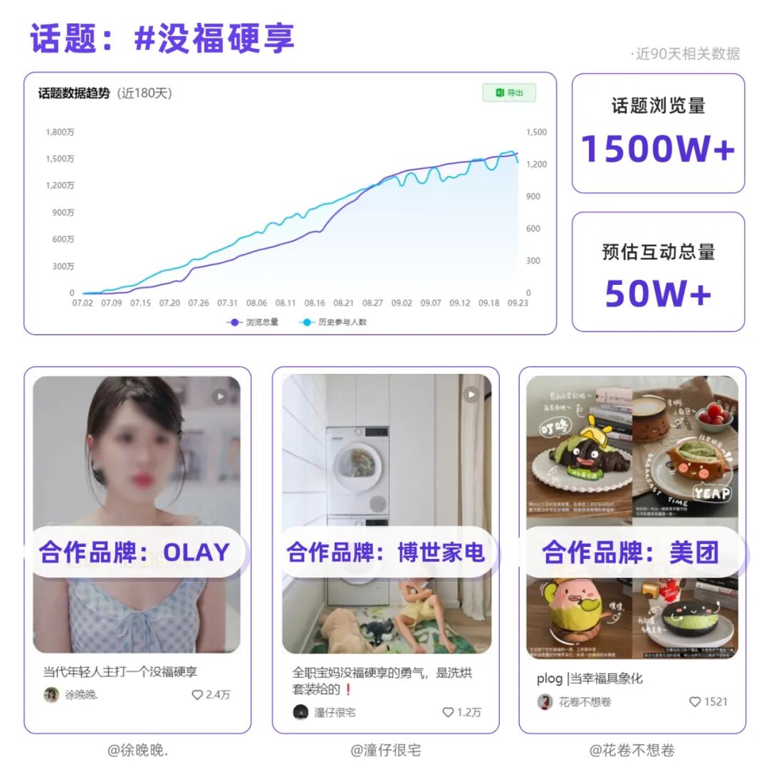 千瓜数据显示,秉持“省这点富不了,花这点穷不了”观念的年轻人,让「没福硬享」成为风潮,相关话题浏览量近90天突破1500W。博世、美团、OLAY等品牌捕捉到00后的处事哲学,帮助Ta们在有限的资源里,追求即时的快乐。