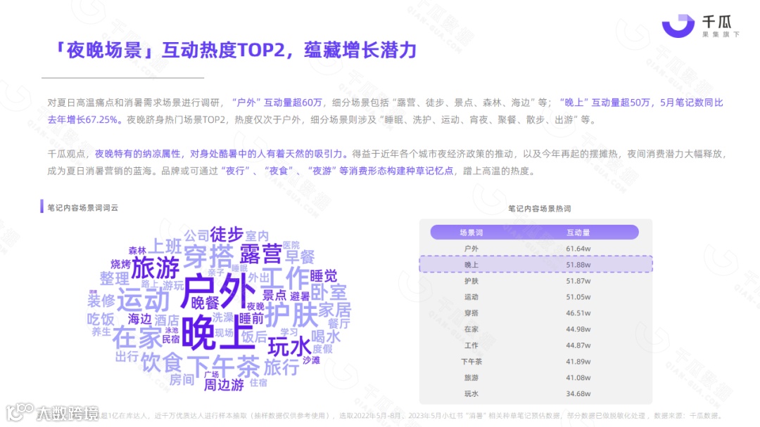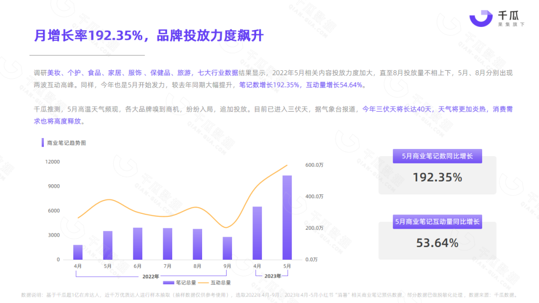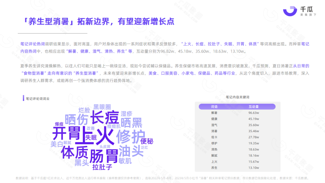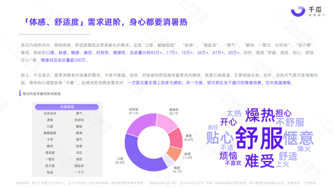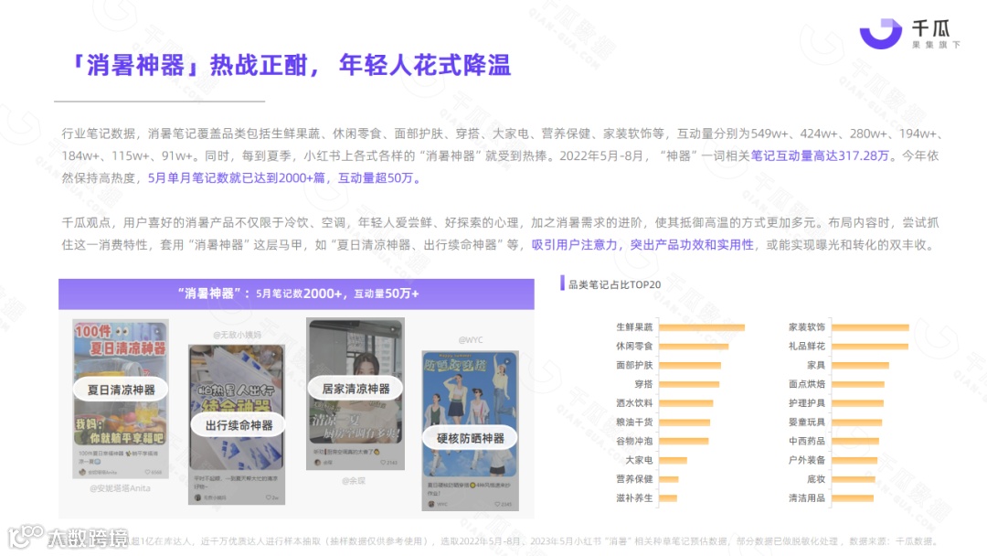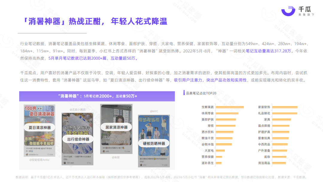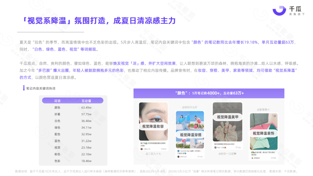 小红书平台5月热门笔记,频现“清凉、消暑、温度、降温”等词,单月相关种草笔记互动量超1000万,降温消暑成刚需。