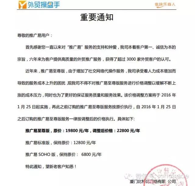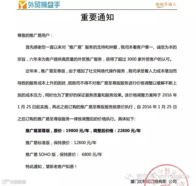 近年来,推广易至尊版,由于增加了社交网络代操作服务,我司承受着人力成本增加而导致的服务成本上升的困扰,现我司不得不对推广易至尊版服务进行价格调整以缓解不断上涨的成本压力,同时也为了更好的保证服务质量和服务效果。该价格调整方案将于2016年1月25日起实施,再此之前订购的推广易至尊版服务按原价执行,自2016年1月25日之后订购的推广易至尊版服务一律按调整后的价格执行。具体如下: