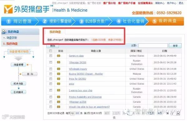 3、 询盘量3230条(不含采购商直接发送到客户邮箱的询盘)