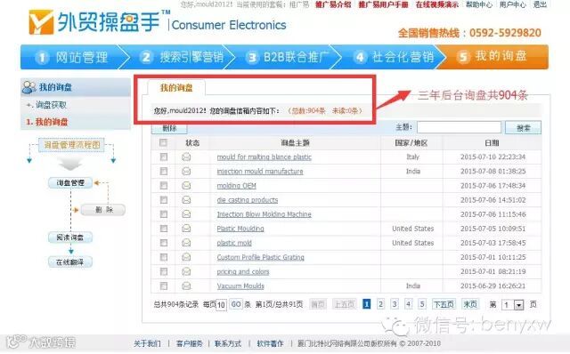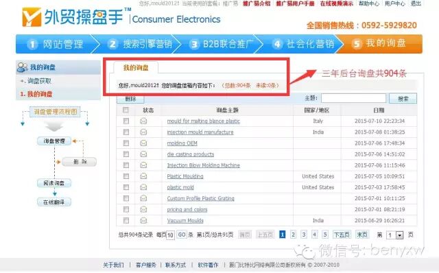 3、询盘量904条(不含采购商直接发送到客户邮箱的询盘)