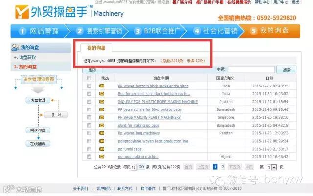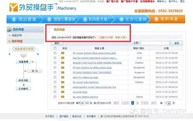 3、 询盘量2218 条(不含采购商直接发送到客户邮箱的询盘)