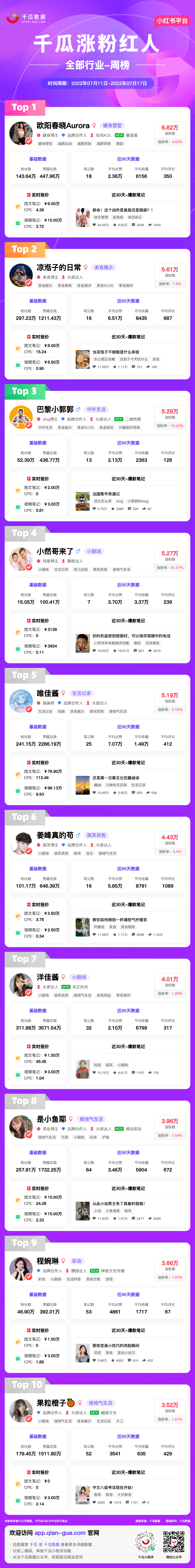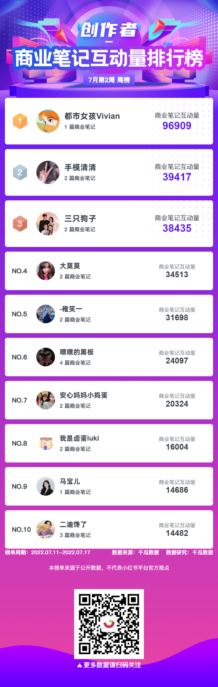 周榜 | 7月第2周千瓜品牌机构创作者排行榜(小红书平台)