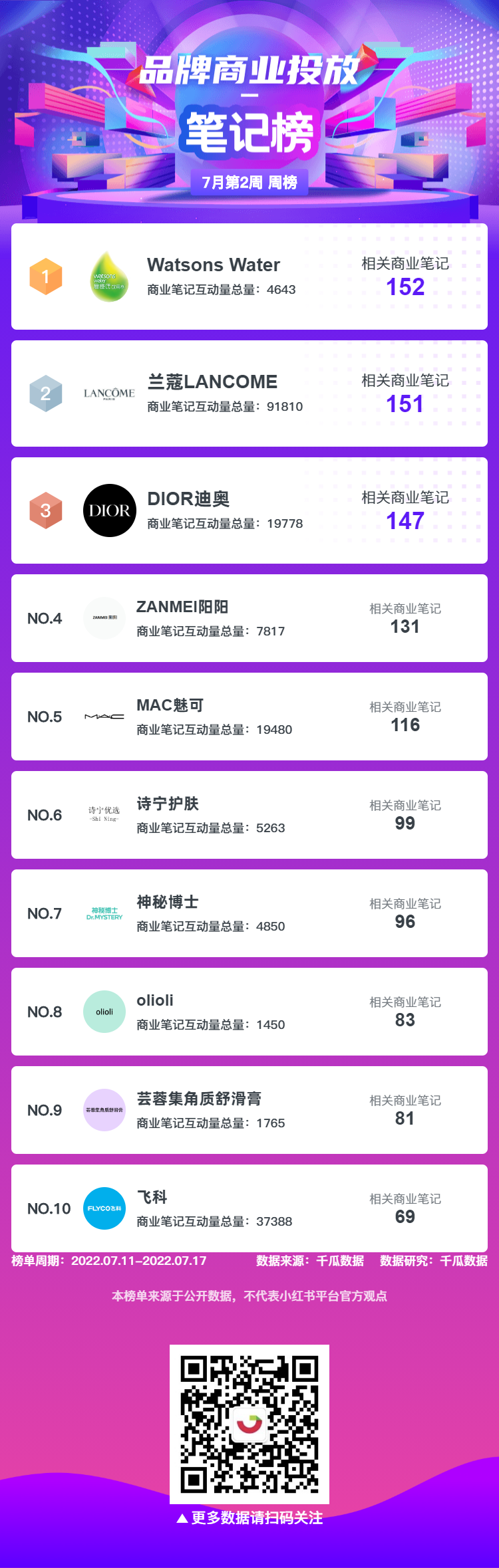 周榜 | 7月第2周千瓜品牌机构创作者排行榜(小红书平台) 千瓜
