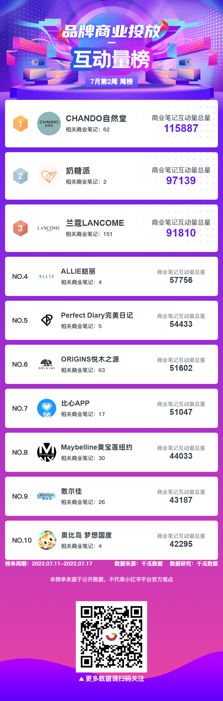 品牌商业投放-互动量榜“CHANDO自然堂”排名第一,商业笔记互动量总量115887“奶糖派”排名第二,商业笔记互动量总量97139兰蔻LANCOME”排名第三,商业笔记互动量总量91810