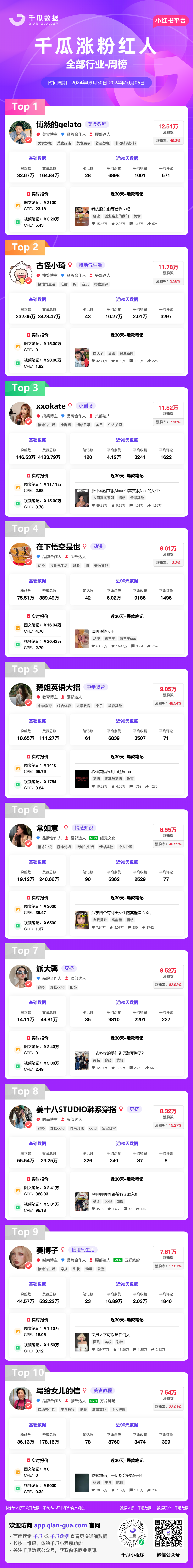 小红书涨粉红人-全部行业中“博然的gelato”排名第一,涨粉数12.51万;“古怪小琦”排名第二,涨粉数11.78万;“xxokate ”排名第三,涨粉数11.52万。