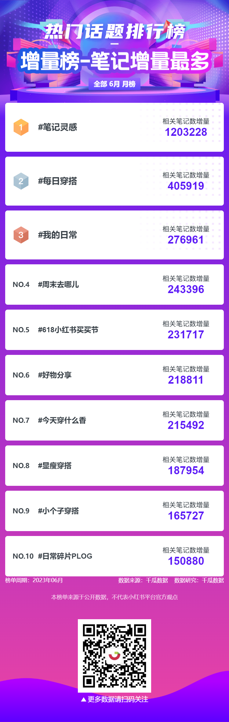 热门话题排行榜中“笔记灵感”排名第一,相关笔记数增量1203228;“每日穿搭” 排名第二,相关笔记数增量405919篇;“我的日常”排名第三,相关笔记数增量276961篇。