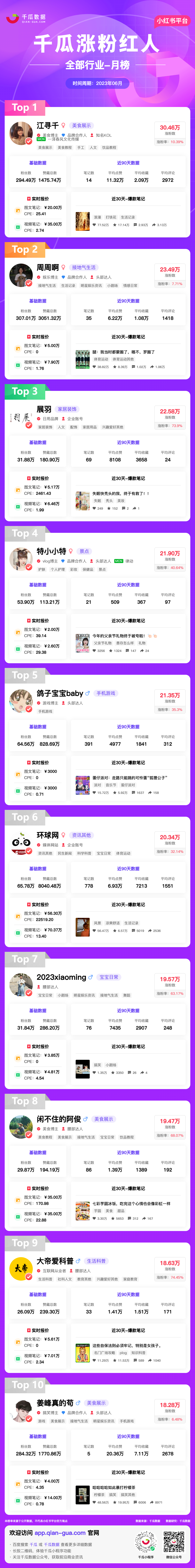 小红书涨粉红人-全部行业中“江寻千”排名第一,涨粉数30.46万;“周周啊”排名第二,涨粉数23.49万;“羽展”排名第三,涨粉数22.58万。