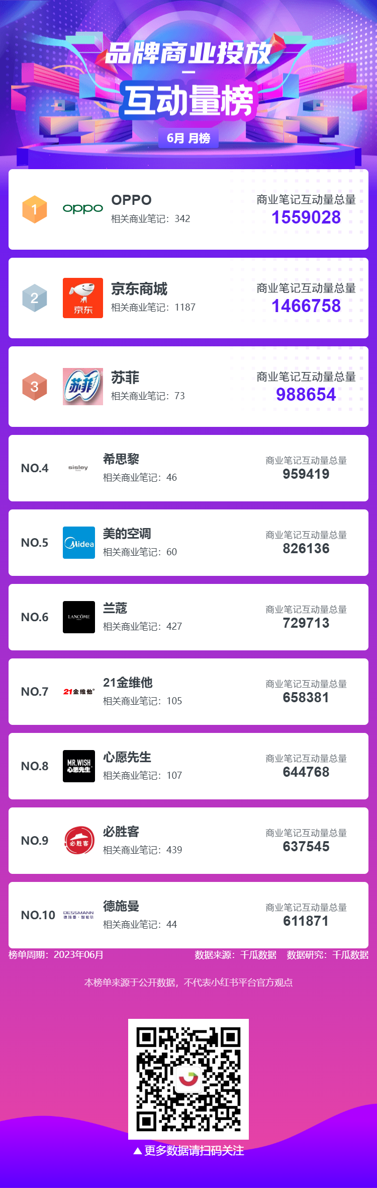 品牌商业投放-互动量榜中“OPPO”排名第一,商业笔记互动量总量1559028;“京东商城” 排名第二,商业笔记互动量总量1466758;“苏菲” 排名第三,商业笔记互动量总量988654。