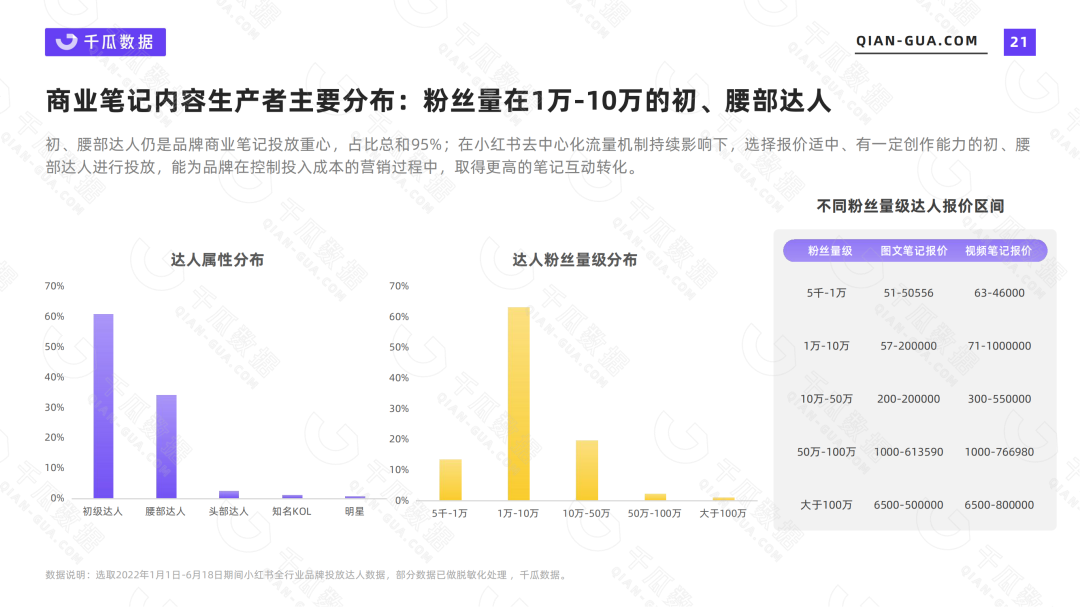 众多品牌在商业笔记投放中便选择以初级达人为主要目标,从内容生产者主要分布数据中可以发现,初级达人占比为61%,与腰部达人占比总和高达95%,达人粉丝量区间主要集中在1万-10万。