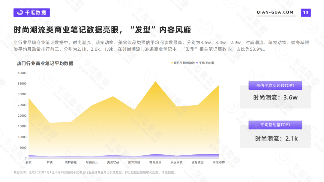 再从商业笔记平均数据来看,时尚潮流类笔记的预估平均阅读数与互动量均为最高,为3.6w和2.1k,萌宠动物类商业笔记次之,预估平均阅读数为2.9w,平均互动量为2k。