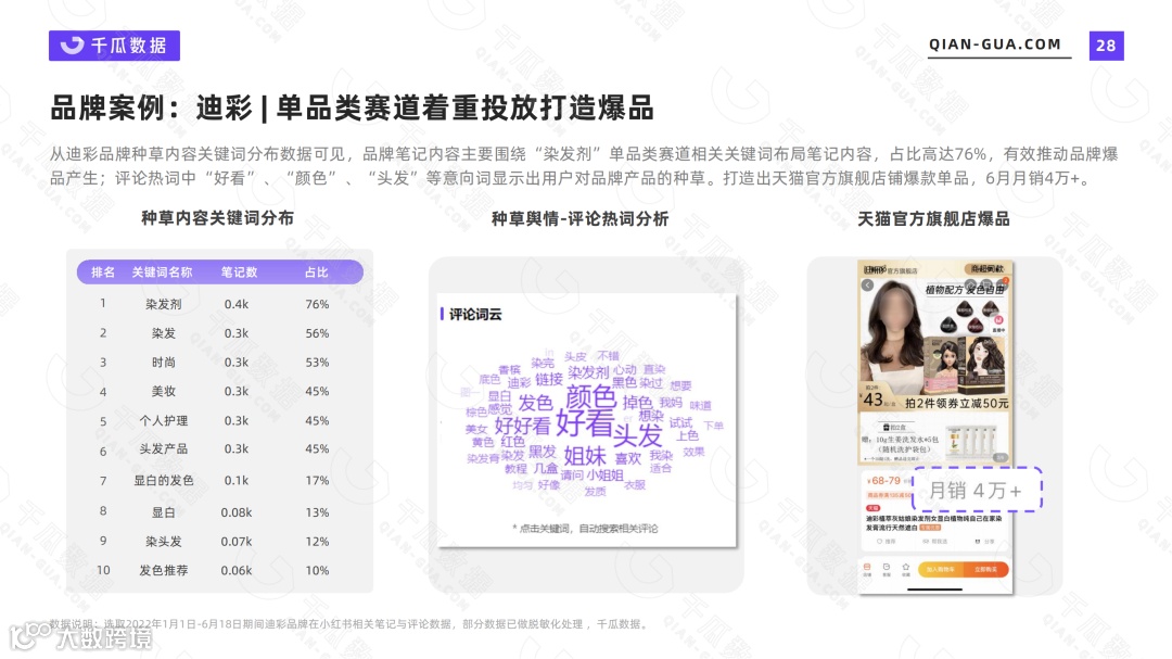 笔记评论中,“好看”、“颜色”、“头发”等高关联意向词排行前列,可见品牌对用户实现了深度种草。