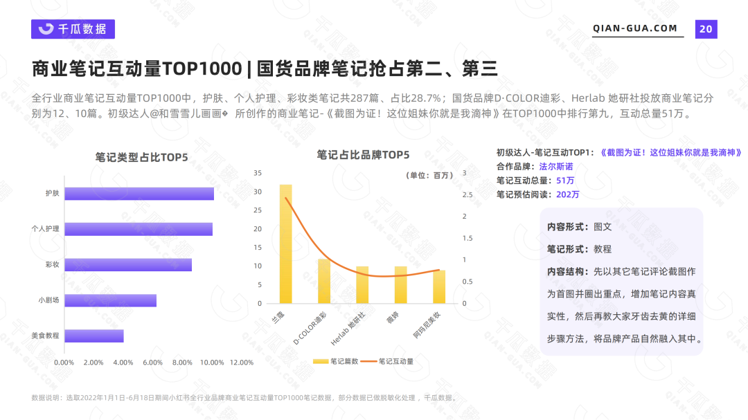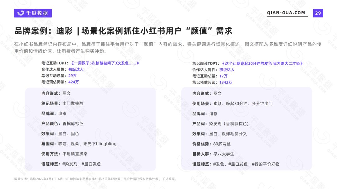 2022上半年,国货品牌在小红书商业笔记投放中取得了可观的数据,在全行业商业笔记互动量TOP1000中,国货美发品牌【迪彩】、卫生巾品牌【她研社】所占比的笔记数量排行第二、第三,仅次于国际美妆品牌【兰蔻】。